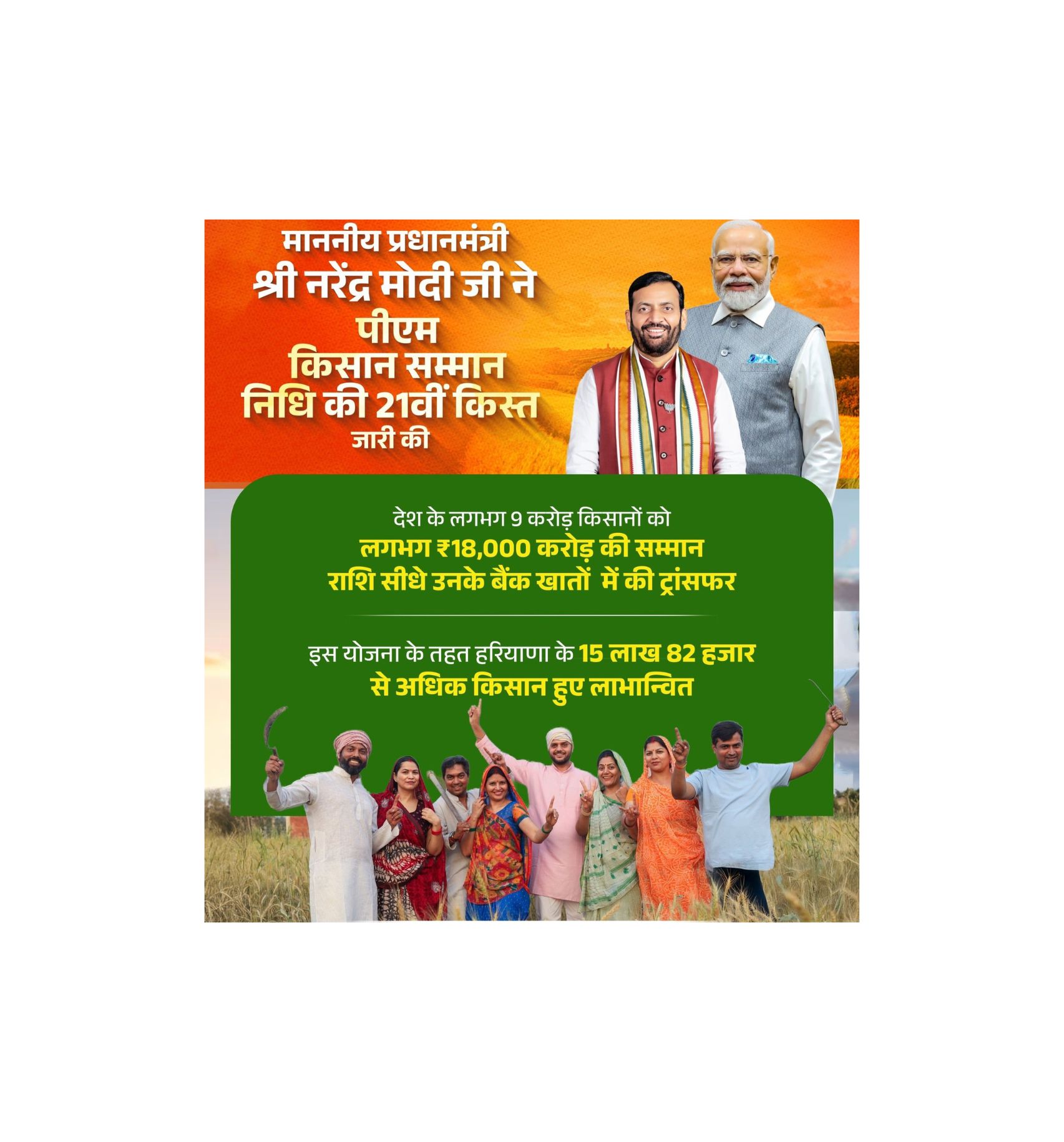 पलवल: पीएम किसान सम्मान निधि योजना की 21वीं किस्त जारी होने के उपलक्ष्य में पलवल में आज एक भव्य राज्य स्तरीय समारोह आयोजित किया गया। कार्यक्रम में हरियाणा के मुख्यमंत्री श्री नायब सिंह सैनी मुख्य अतिथि के रूप में शामिल हुए। बड़े पैमाने पर किसानों और जनप्रतिनिधियों की उपस्थिति में यह समारोह उत्साह और ऊर्जा से भरपूर रहा।