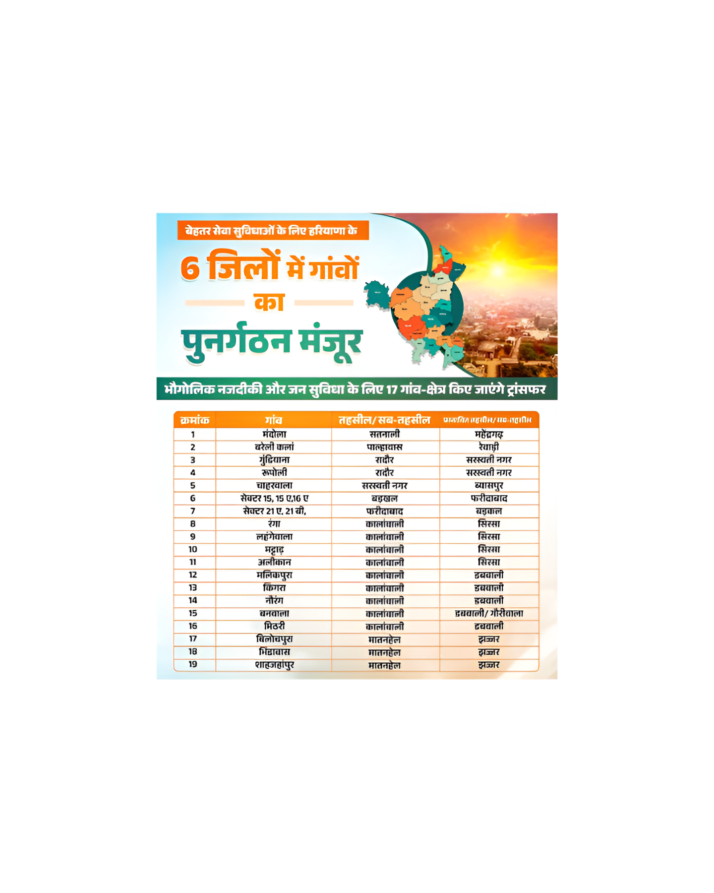 चंडीगढ़। हरियाणा सरकार ने प्रशासनिक और जनसेवा सुविधाओं को और बेहतर बनाने के उद्देश्य से राज्य के 6 जिलों में गांवों के पुनर्गठन को मंजूरी प्रदान की है। इस फैसले के तहत भौगोलिक नजदीकी और आम जनता की सुविधा को ध्यान में रखते हुए 17 गांव-क्षेत्रों का स्थानांतरण किया जाएगा।