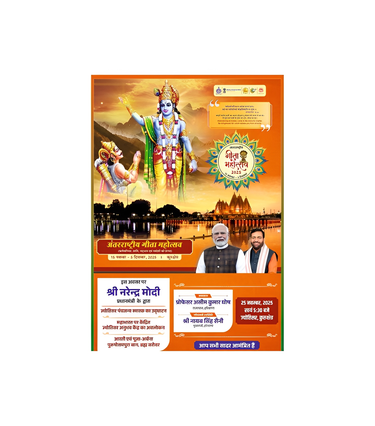 प्रधानमंत्री श्री @narendramodi आज सायं 5:30 बजे, ज्योतिसर, कुरुक्षेत्र में ज्योतिसर पंचामृत स्मारक का उद्घाटन करेंगे और महाभारत पर केंद्रित अनुभव केंद्र का अवलोकन भी करेंगे। इसके बाद प्रधानमंत्री ब्रह्मसरोवर पर महाआरती में हिस्सा लेंगे।#InternationalGitaMahotsav2025#PMModi pic.twitter.com/vLcu7sPBUL