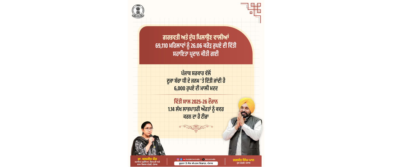 चंडीगढ़। भगवंत सिंह मान के नेतृत्व में पंजाब सरकार महिलाओं के कल्याण और मातृ एवं शिशु स्वास्थ्य सुरक्षा को मजबूत करने के लिए निरंतर जन-कल्याणकारी कदम उठा रही है। इसी कड़ी में पंजाब सरकार ने चालू वित्त वर्ष के दौरान गर्भवती महिलाओं और धात्री माताओं को ₹26.06 करोड़ की वित्तीय सहायता वितरित की है।
