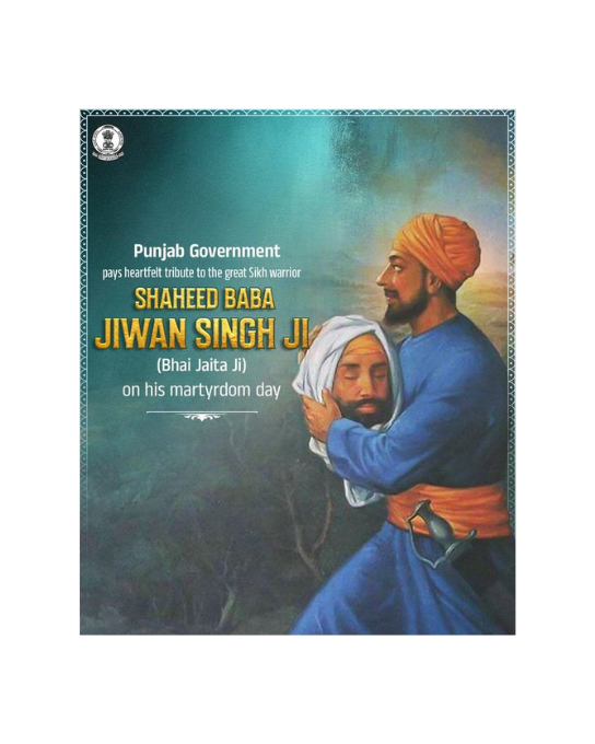 मुख्यमंत्री Bhagwant Singh Mann के नेतृत्व में पंजाब सरकार ने महान सिख योद्धा Shaheed Baba Jiwan Singh Ji (Bhai Jaita Ji) के शहादत दिवस पर उन्हें भावभीनी श्रद्धांजलि अर्पित की। इस अवसर पर मुख्यमंत्री ने उनके अद्वितीय साहस, त्याग और बलिदान को नमन करते हुए कहा कि बाबा जीवन सिंह जी का जीवन सिख इतिहास में शौर्य और निस्वार्थ सेवा का अनुपम उदाहरण है।